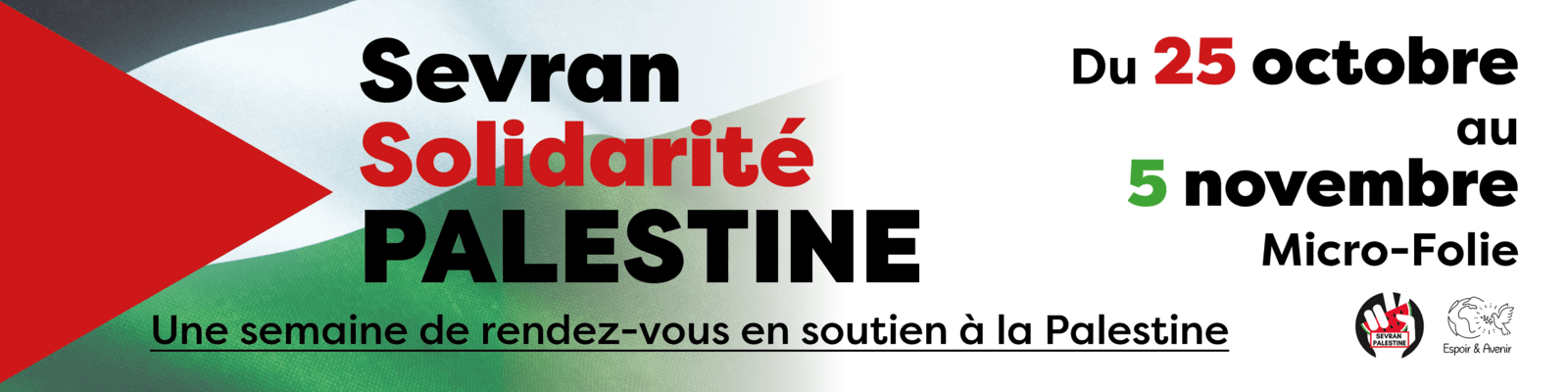 La Semaine de la Palestine à Sevran Les 25 et 29 octobre et le 5 novembre prochain à la Micro Folie Sevran met à l'honneur la Palestine avec des expositions, ateliers créatifs, projection-débat...