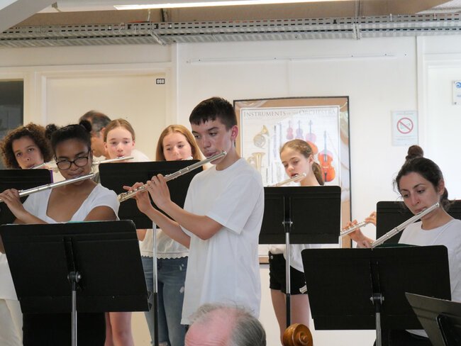 Avant le fameux jour J, des week-ends de travail ont été organisés avec les autres conservatoires de Seine-Saint-Denis. « On était plus de 250 et ça n’a pas été facile de trouver des salles assez grandes pour tous nous accueillir ! Nous avons surtout répété dans des gymnases », explique Christine Bureau. Le matin du samedi 9 juin, tous les participants se sont réunis pour une grosse répétition générale avant le début du concert à 15h. « C’était énorme. Quand les élèves sont entrés dans la salle, ils avaient des étoiles plein les yeux, aussi bien les adultes que les enfants. C’est un souvenir gravé à vie. » Et le concert fut splendide avec 1000 flûtistes rassemblés en un véritable orchestre. A la question de savoir si prendre place sur une si grande scène n’était pas trop stressant, Christine Bureau explique : « Ils ont carrément perdu la notion de peur sur scène quand ils ont senti cette marée de flûtistes. Ça leur a donné une force incroyable. On se sentait vraiment comme une famille de flûtistes alors qu’on ne se connaissait pas. »
