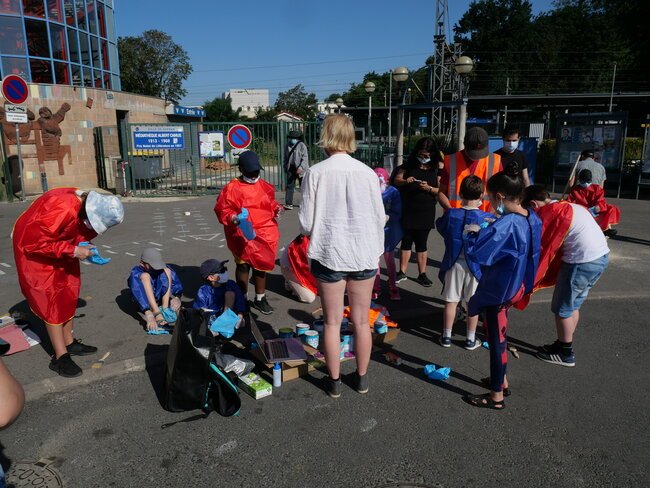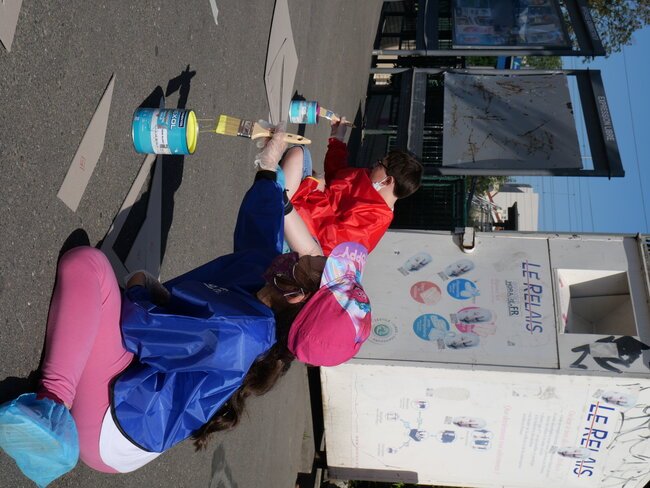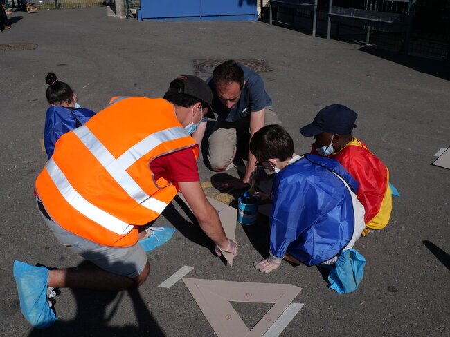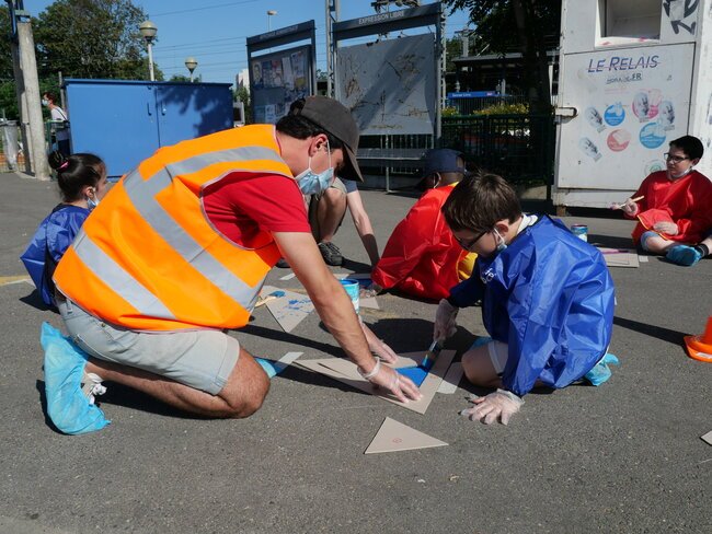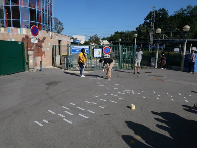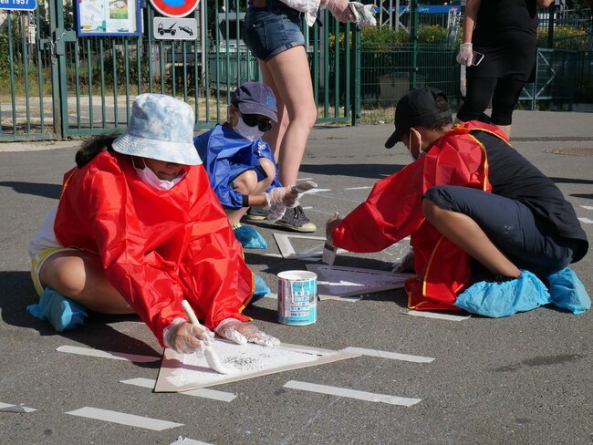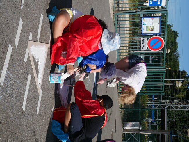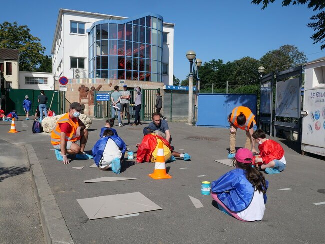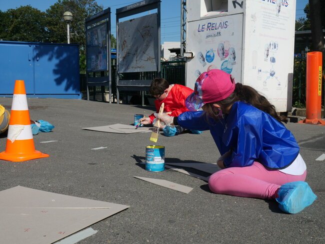 Lundi 19 juillet, une dizaine d’enfants des centres de loisirs pavillon aux histoires et Jules-Verne ont participé à un chantier participatif sur la place de la gare dans le cadre des travaux du Grand Paris. Ils ont dessiné et mis en peinture des marquages au sol avec des motifs en 3 dimensions notamment.