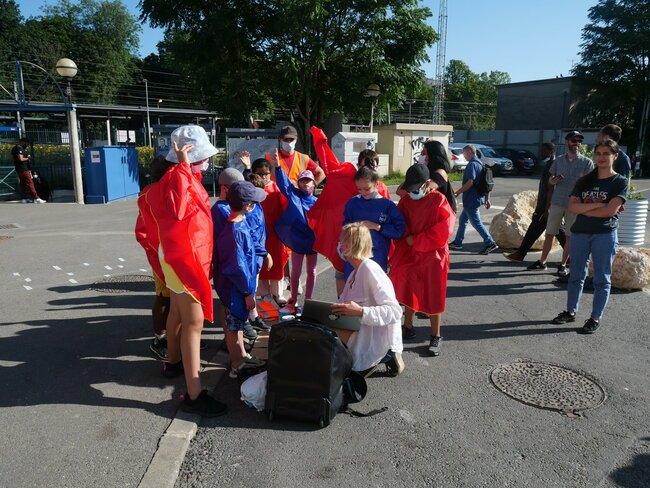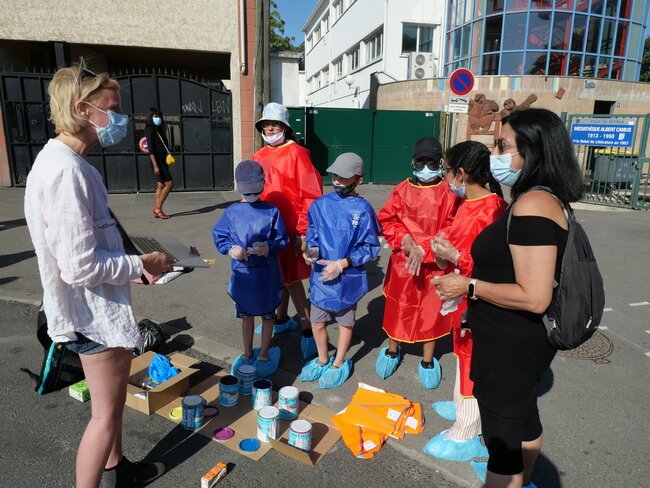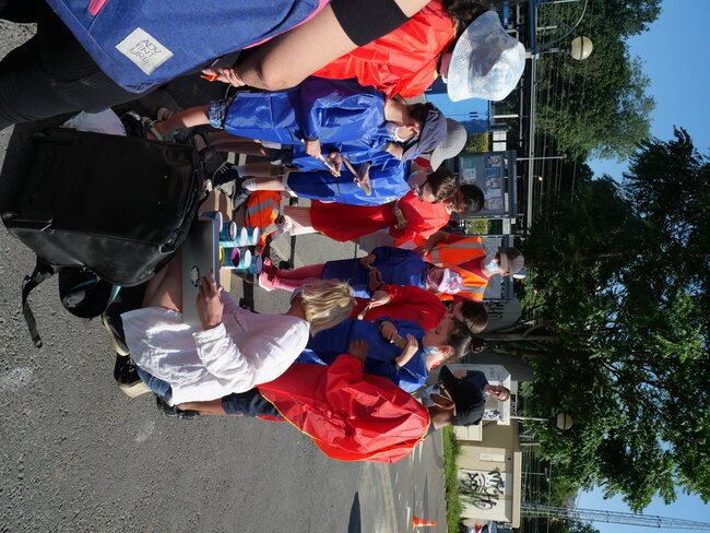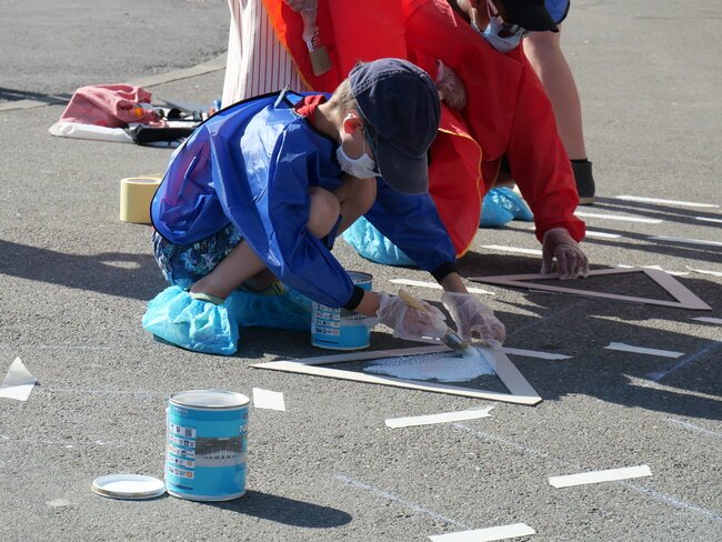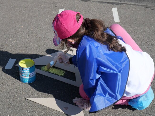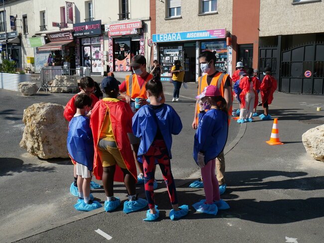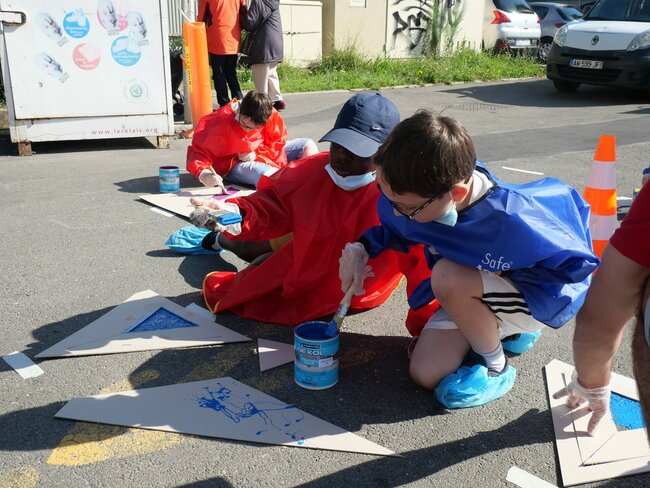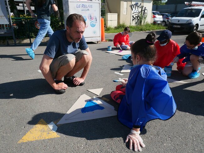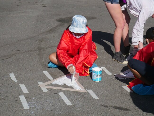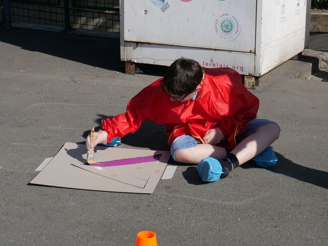Lundi 19 juillet, une dizaine d’enfants des centres de loisirs pavillon aux histoires et Jules-Verne ont participé à un chantier participatif sur la place de la gare dans le cadre des travaux du Grand Paris. Ils ont dessiné et mis en peinture des marquages au sol avec des motifs en 3 dimensions notamment.
