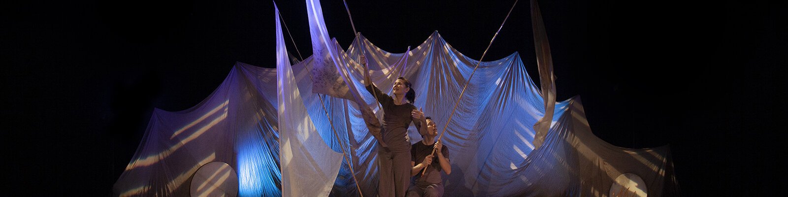 Deux musiciens-chanteurs se rencontrent, jouent de leurs corps et de la matière, installent un univers doux et enveloppant dans lequel vibrent la lumière et les sons. Plongeant dans un monde aquatique évoquant les premières cellules, ils voyagent à travers l’histoire du vivant, traversant plusieurs étapes de transformation à la frontière entre végétal, animal, minéral… En cheminant ainsi, ils interrogent ce qui fait notre humanité et notre lien étroit à la nature.
